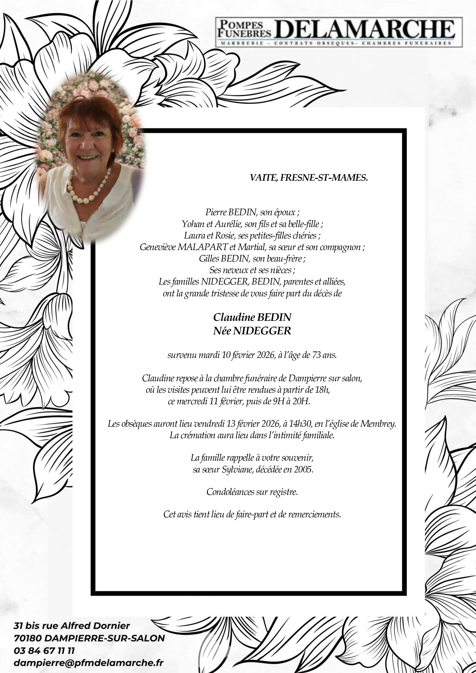 C’est avec une grande tristesse que nous vous annonçons le décès de Claudine BEDIN survenu le mardi 10 février 2026 à Vaite.