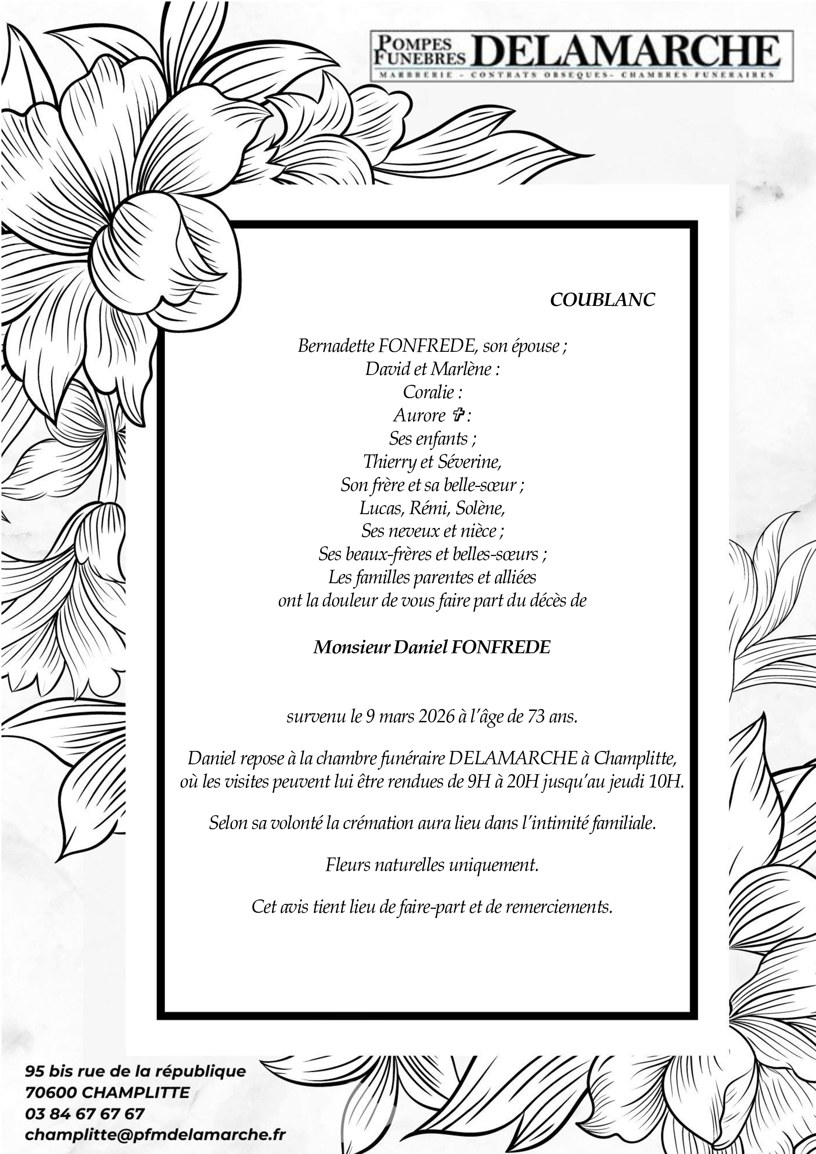 C’est avec une grande tristesse que nous vous annonçons le décès de Daniel FONFREDE survenu le lundi 09 mars 2026 à Coublanc.