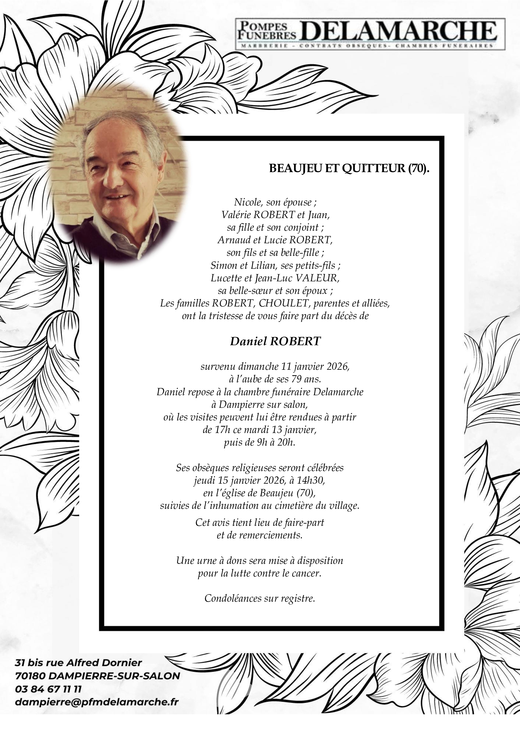 C’est avec une grande tristesse que nous vous annonçons le décès de Daniel ROBERT survenu le dimanche 11 janvier 2026 à Beaujeu et Quitteur. La cérémonie se déroulera le jeudi 15 janvier 2026 à 14h30 à l’adresse suivante : dampierre sur salon beaujeu - 70100 Beaujeu et Quitteur.