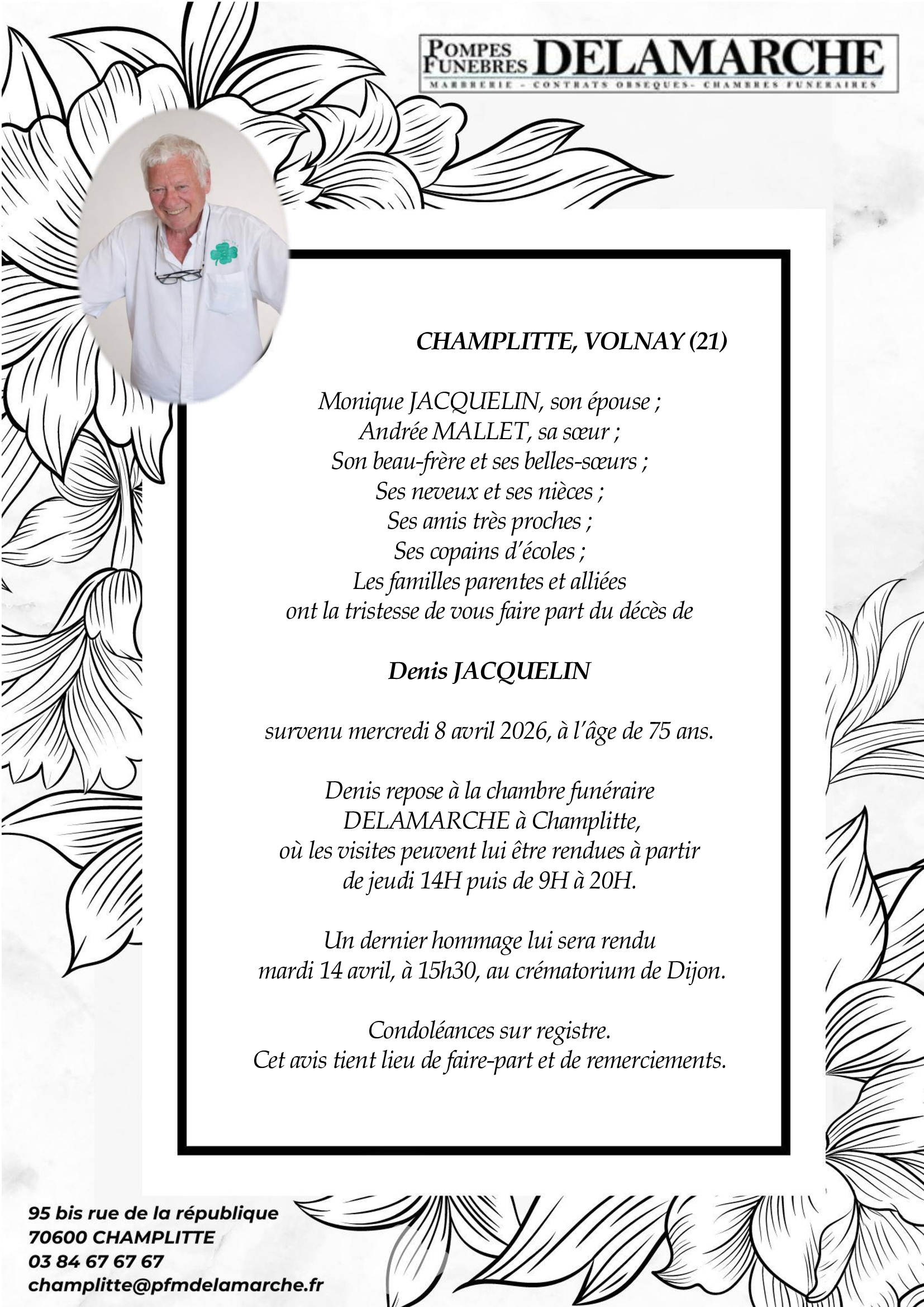 C’est avec une grande tristesse que nous vous annonçons le décès de Denis JACQUELIN survenu le mercredi 08 avril 2026 à Gray.