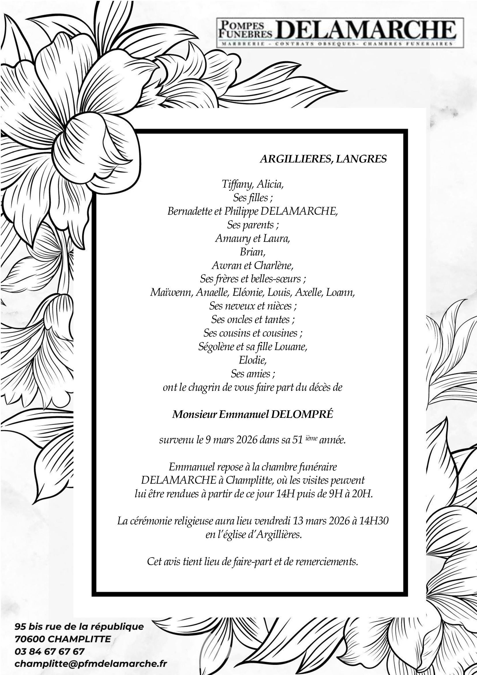 C’est avec une grande tristesse que nous vous annonçons le décès d’Emmanuel DELOMPRÉ survenu le lundi 09 mars 2026 à Gray.