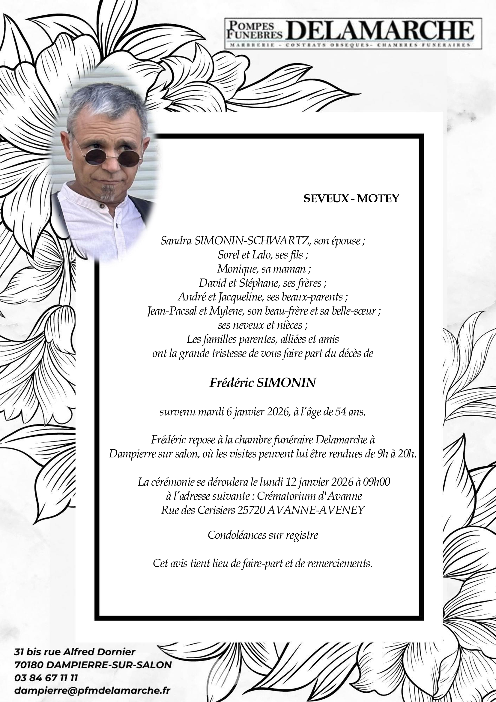 Frédéric Repose à la chambre funéraire DELAMARCHE, à Dampierre-sur-Salon, au 31 bis rue Alfred Dornier, du mercredi 7 janvier jusqu'au dimanche 11 janvier, de 9h à 20h.