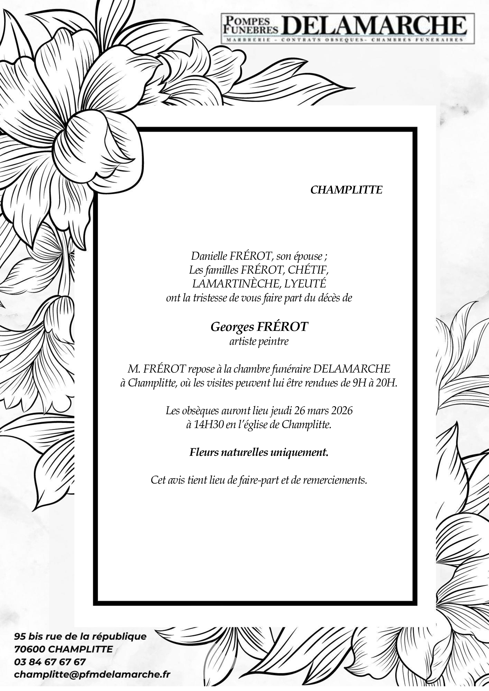C’est avec une grande tristesse que nous vous annonçons le décès de Georges FRÉROT survenu le dimanche 22 mars 2026 à Gray.