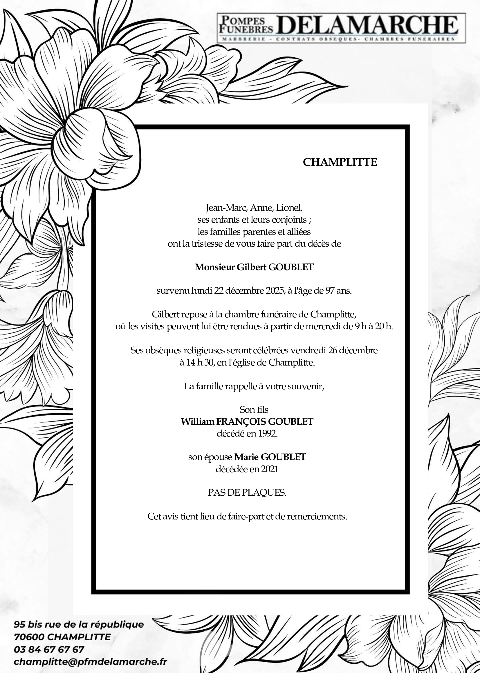 C’est avec une grande tristesse que nous vous annonçons le décès de Gilbert GOUBLET survenu le lundi 22 décembre 2025 à Champlitte. La cérémonie se déroulera le vendredi 26 décembre 2025 à 14h30 à l’adresse suivante : 70600 Champlitte.