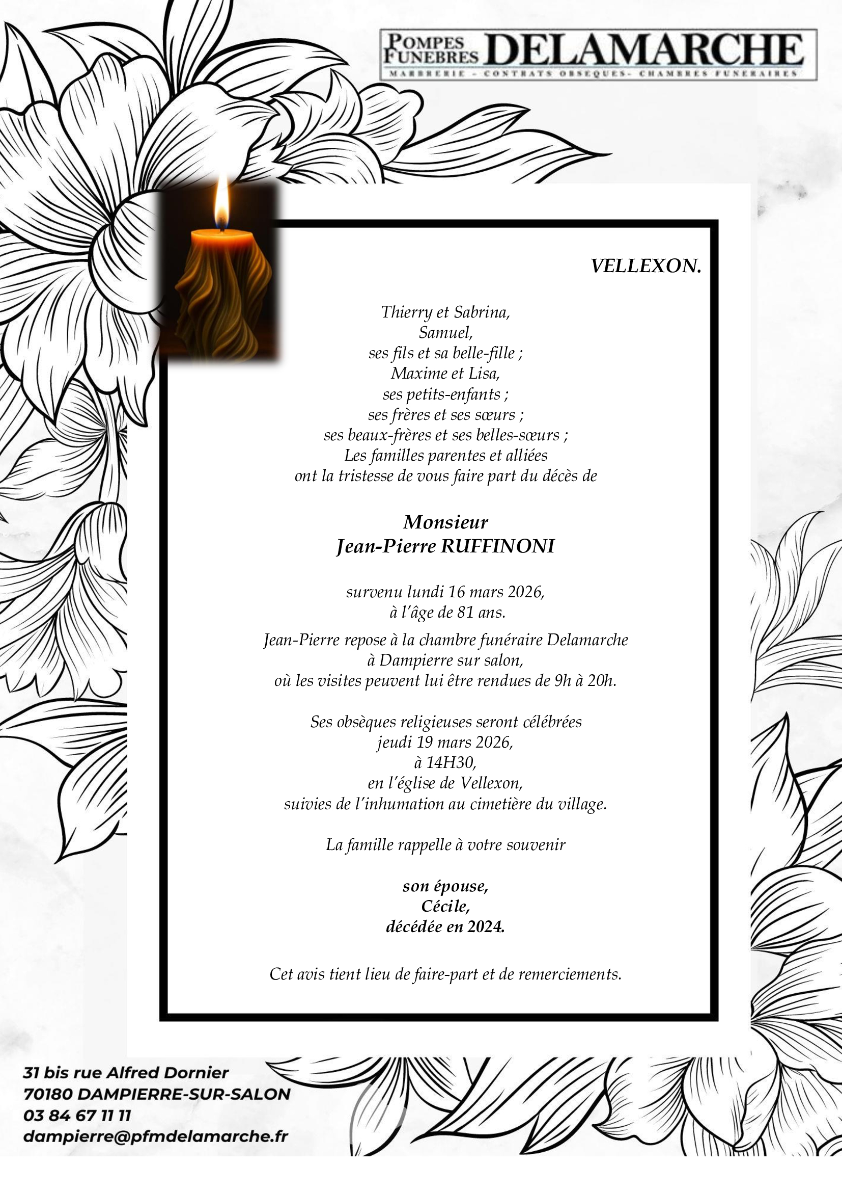 C’est avec une grande tristesse que nous vous annonçons le décès de Jean-Pierre RUFFINONI survenu le lundi 16 mars 2026 à Gray. La cérémonie se déroulera le jeudi 19 mars 2026 à 14h30 à l’adresse suivante : VELLEXON - 70130 Vellexon Queutrey et Vaudey.