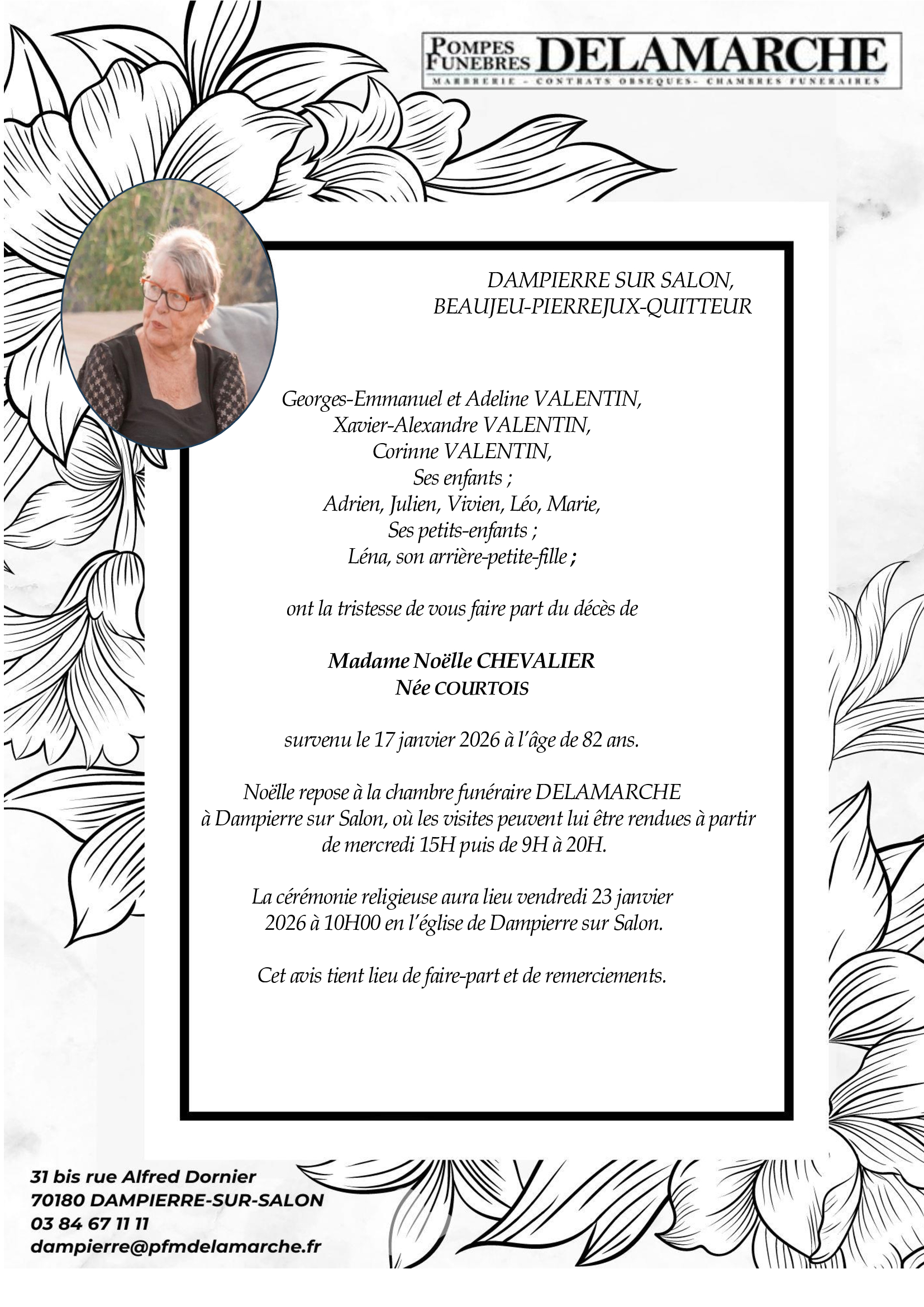 C’est avec une grande tristesse que nous vous annonçons le décès de Noëlle CHEVALIER survenu le samedi 17 janvier 2026 à Gray. La cérémonie se déroulera le vendredi 23 janvier 2026 à 10h00 à l’adresse suivante : 70180 Dampierre sur Salon.