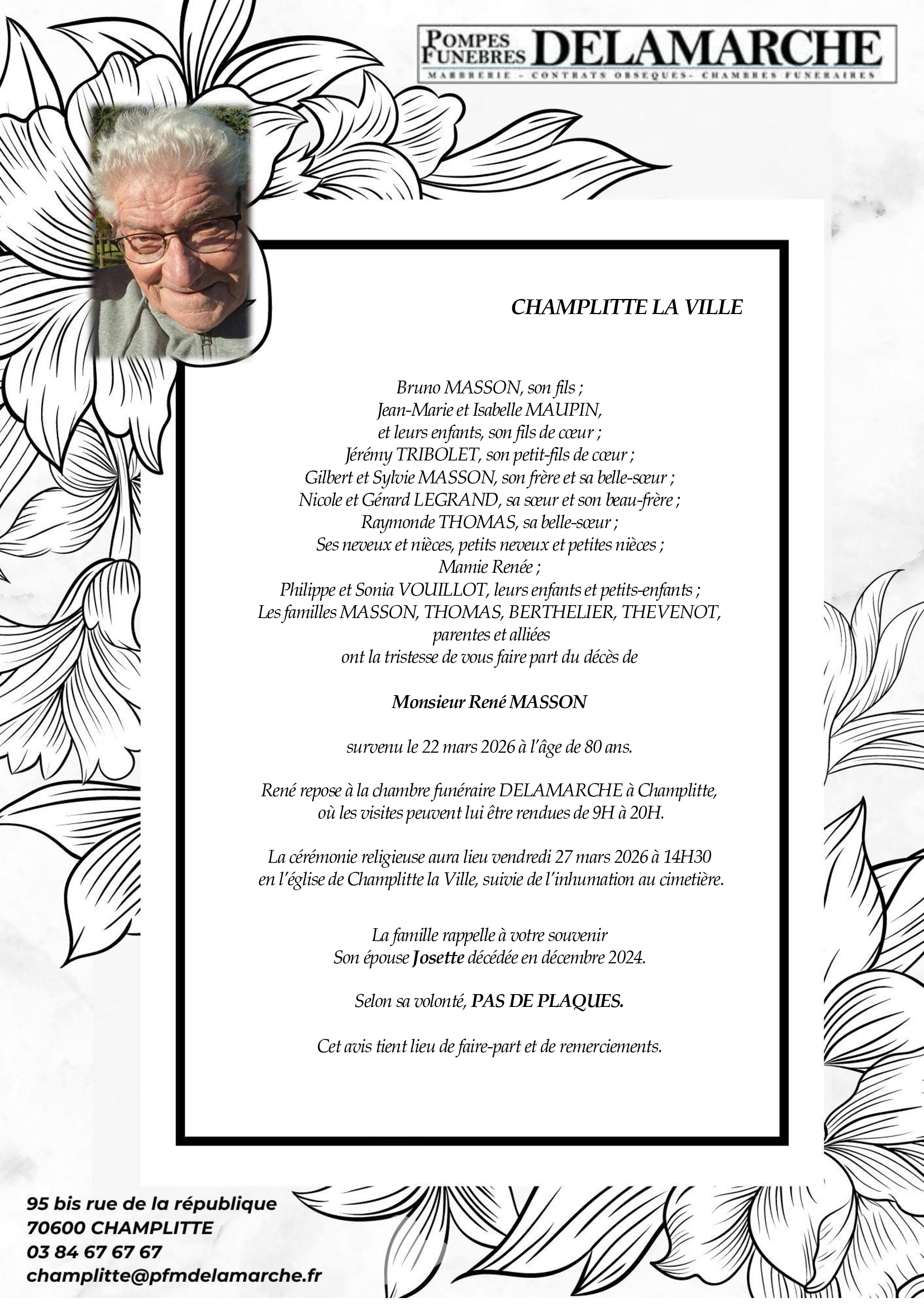 C’est avec une grande tristesse que nous vous annonçons le décès de René MASSON survenu le dimanche 22 mars 2026 à Champlitte la Ville.