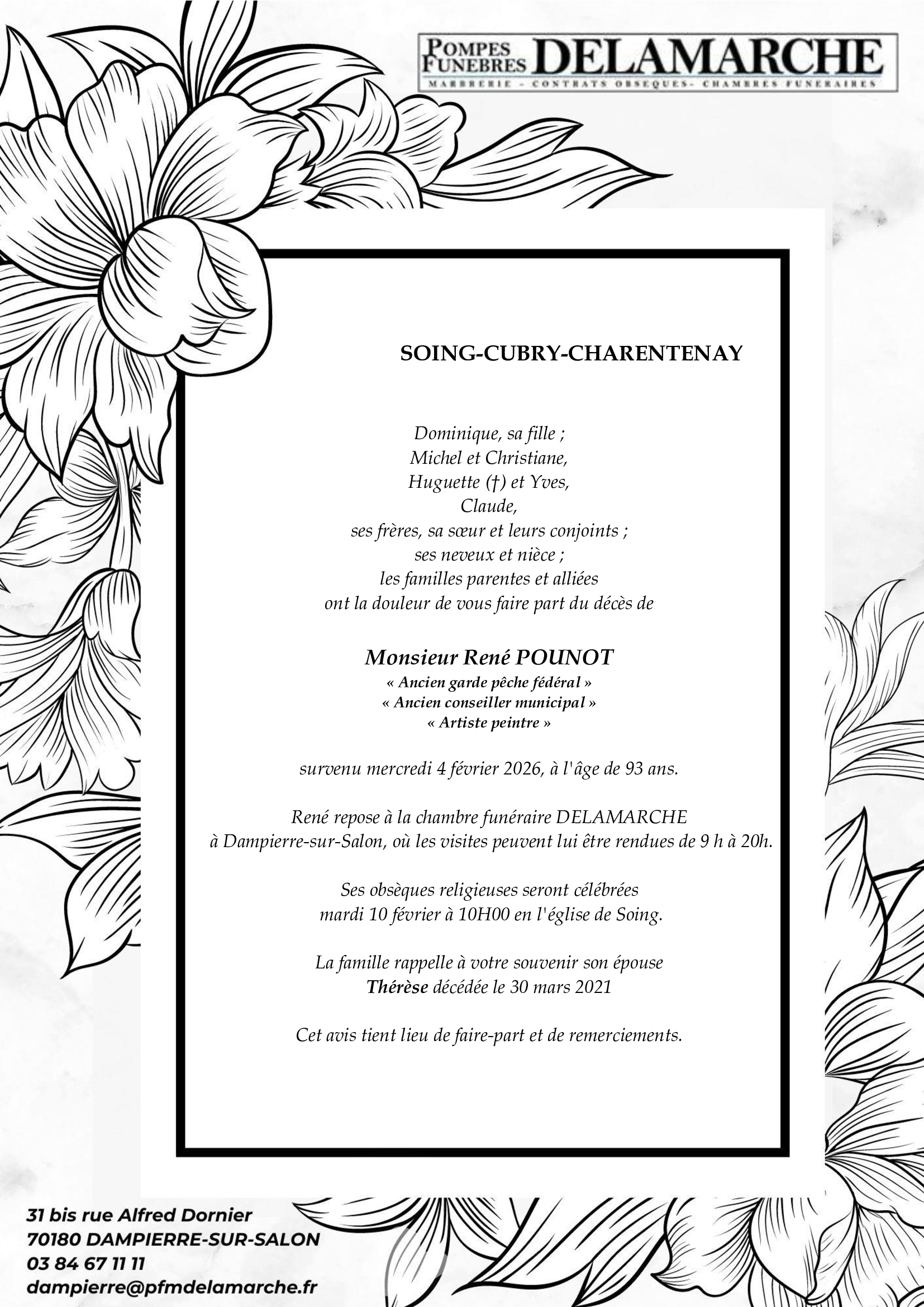C’est avec une grande tristesse que nous vous annonçons le décès de René POUNOT survenu le mercredi 04 février 2026 à Dampierre-sur-Salon.