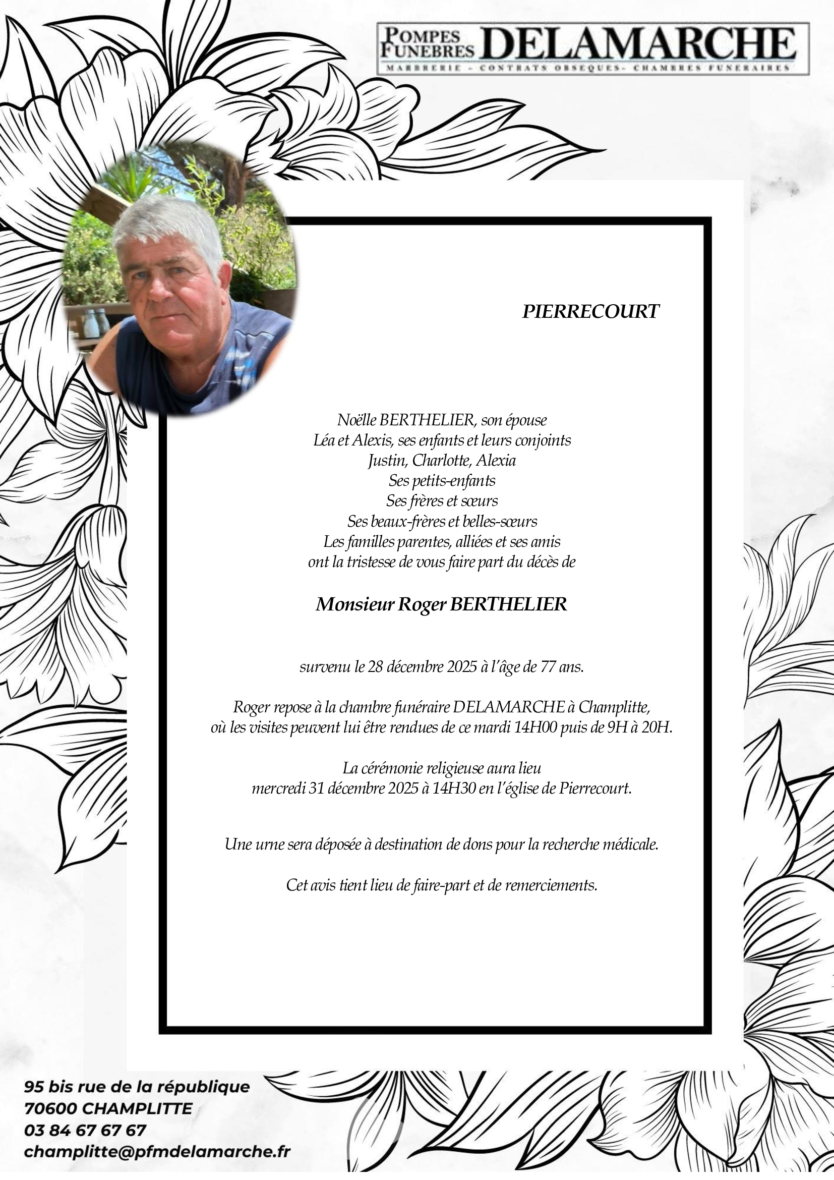 C’est avec une grande tristesse que nous vous annonçons le décès de Roger BERTHELIER survenu le dimanche 28 décembre 2025 à Besancon. La cérémonie se déroulera le mercredi 31 décembre 2025 à 14h30 à l’adresse suivante : 70600 Pierrecourt.
