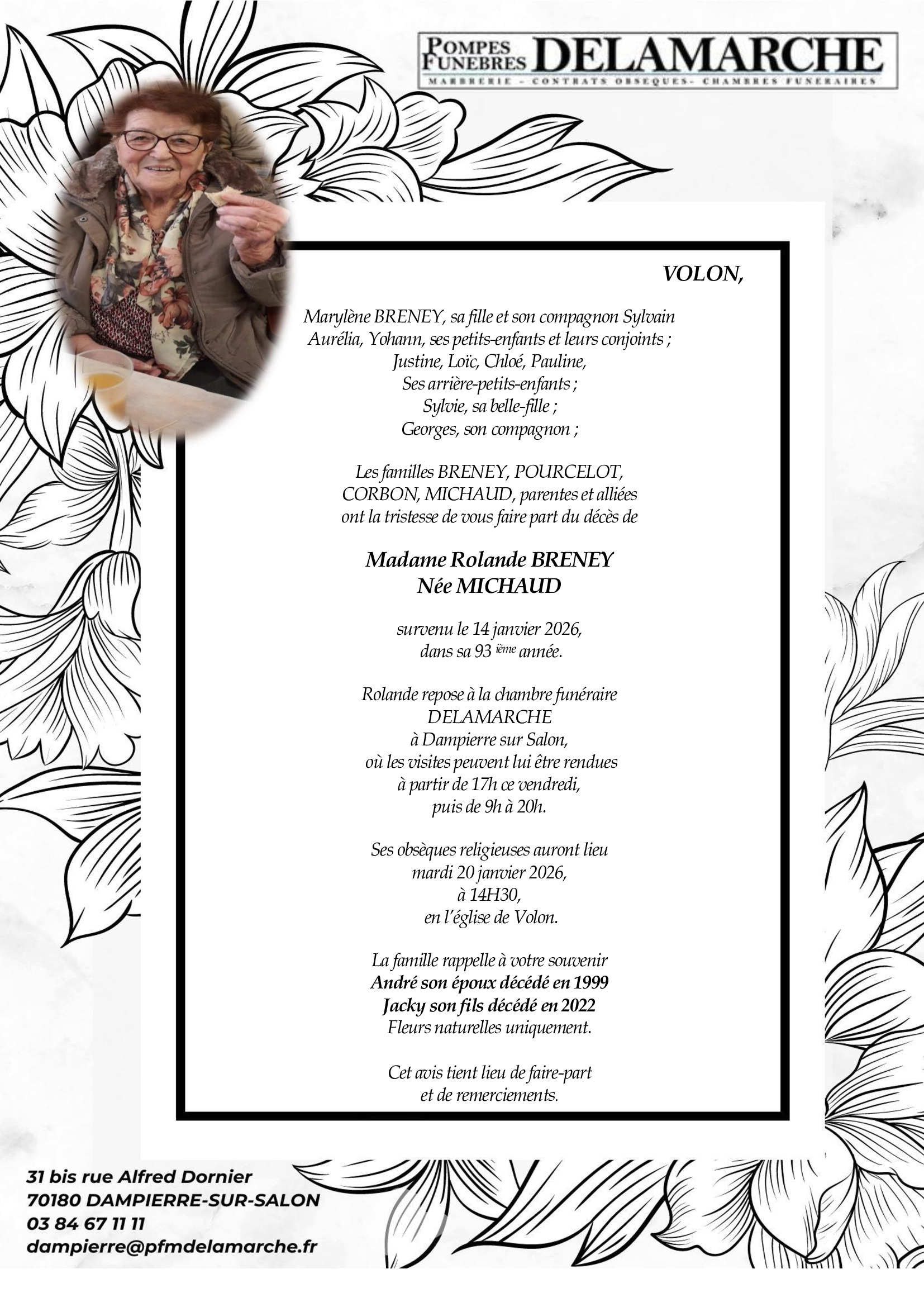 C’est avec une grande tristesse que nous vous annonçons le décès de Rolande BRENEY survenu le mercredi 14 janvier 2026 à Gray. La cérémonie se déroulera le mardi 20 janvier 2026 à 14h30 à l’adresse suivante : 70180 Volon.